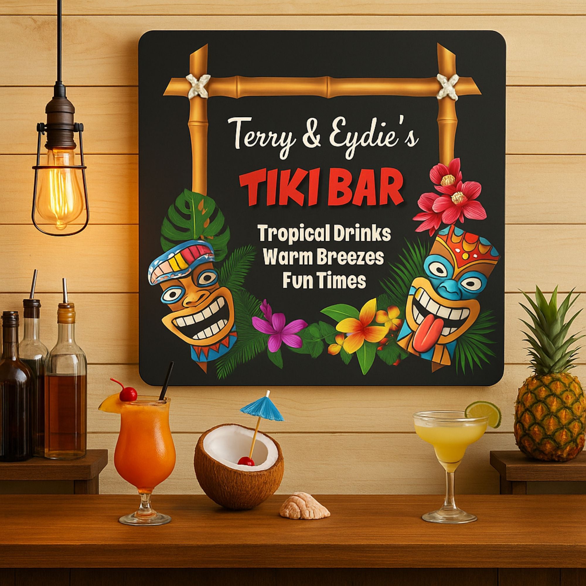 Bring tropical vibes to your space with this personalized tiki bar sign! All text is fully editable, making it perfect for home bars, patios, tiki huts, pool areas, or beach-themed décor. Each sign is crafted with vivid tropical artwork and premium materials designed to last indoors or outdoors.