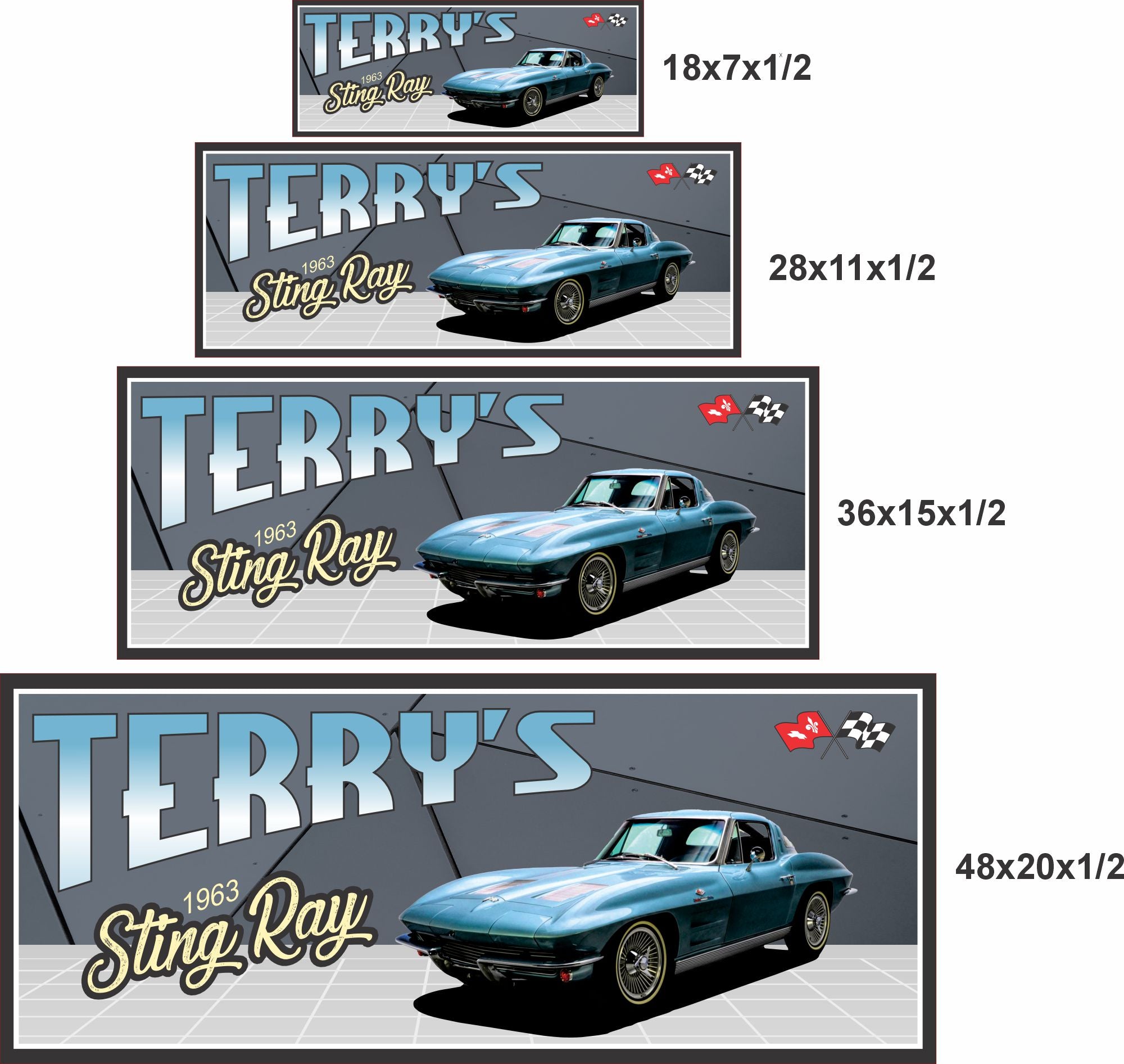 Give your garage, workshop, or man cave a standout feature with this personalized 1963 classic car sign. The bold retro styling and sleek vintage car artwork create the perfect focal point for any automotive enthusiast. All text can be personalized, allowing you to customize the name or title at the top while keeping the model year accurate to the car shown.