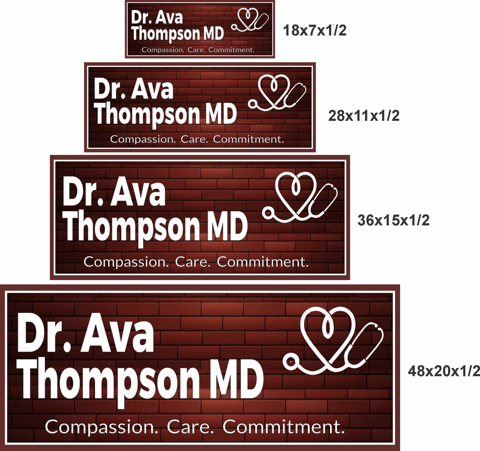 Personalized medical office sign with doctor name, stethoscope graphic, and the phrase Compassion Care Commitment on a brick background.