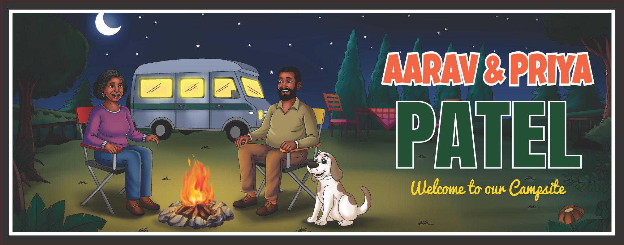 Create a warm and welcoming campsite with this Personalized RV Campsite Sign, designed especially for RV travelers, outdoor adventurers, and families who love the camping lifestyle. Featuring a beautifully illustrated Indian couple relaxing by a glowing campfire with their dog, and their RV illuminated beneath a starry night sky, this sign adds personality and charm to any outdoor space.