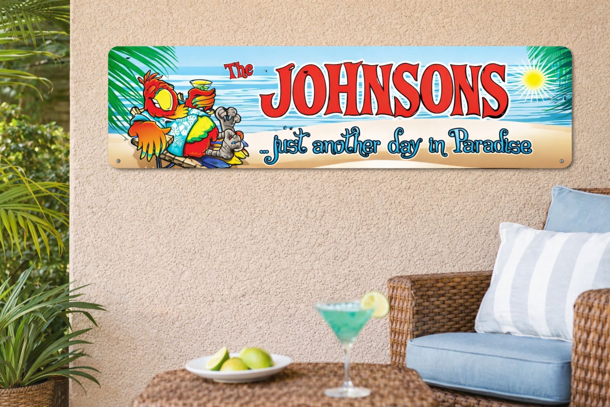 Personalized Just Another Day in Paradise Tropical Beach House Tiki Bar Sign with Parrot