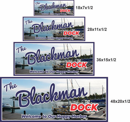 Enhance your dock space with our custom nautical décor! This personalized dock sign features a serene marina scene complete with a pier and tranquil rows of boats. The distant shoreline is adorned with tall palm trees, lending a tropical island flair to this distinctive boat-themed piece. Your chosen name is prominently displayed above the word “Dock” in vibrant red, complemented by a customizable tagline of your choice.