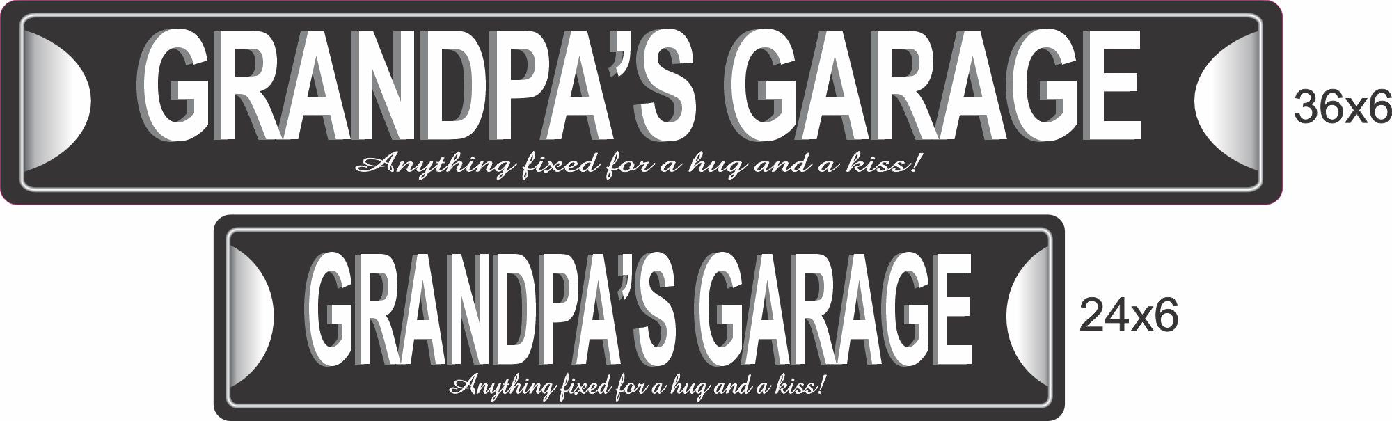 Two Grandpa’s Garage aluminum signs shown side by side in 24×6 and 36×6 sizes