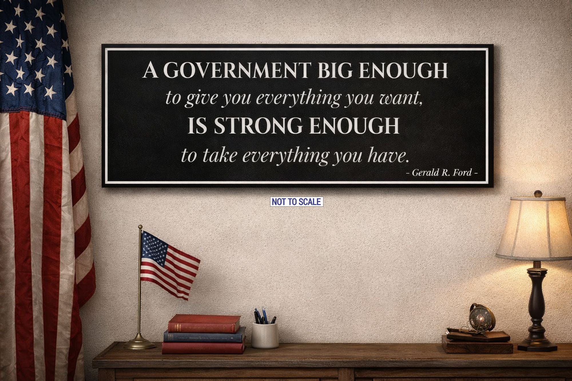 Make a powerful statement with this bold quote wall sign featuring a timeless message about freedom and government. The high-contrast typography and clean layout create a classic, authoritative look that works beautifully in home offices, libraries, studies, and patriotic décor settings.