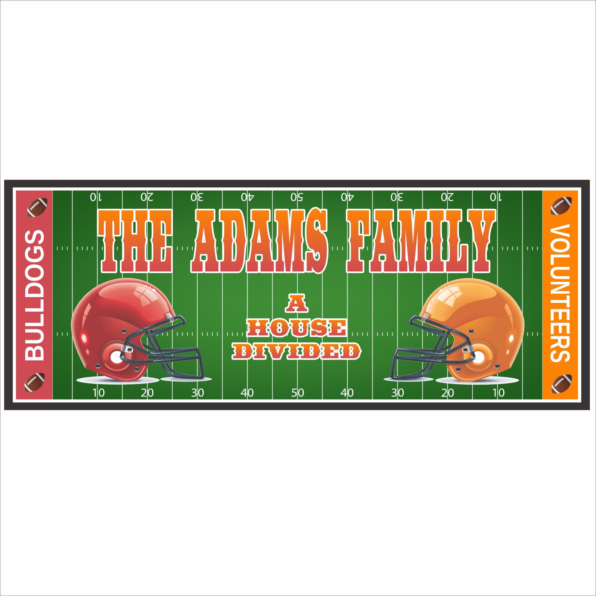 Celebrate your family’s football pride with a personalized House Divided sign designed for true fans. This bold, stadium-inspired wall sign features a realistic football field background with two opposing helmets facing off, making it perfect for sports rooms, dens, man caves, or game-day spaces.