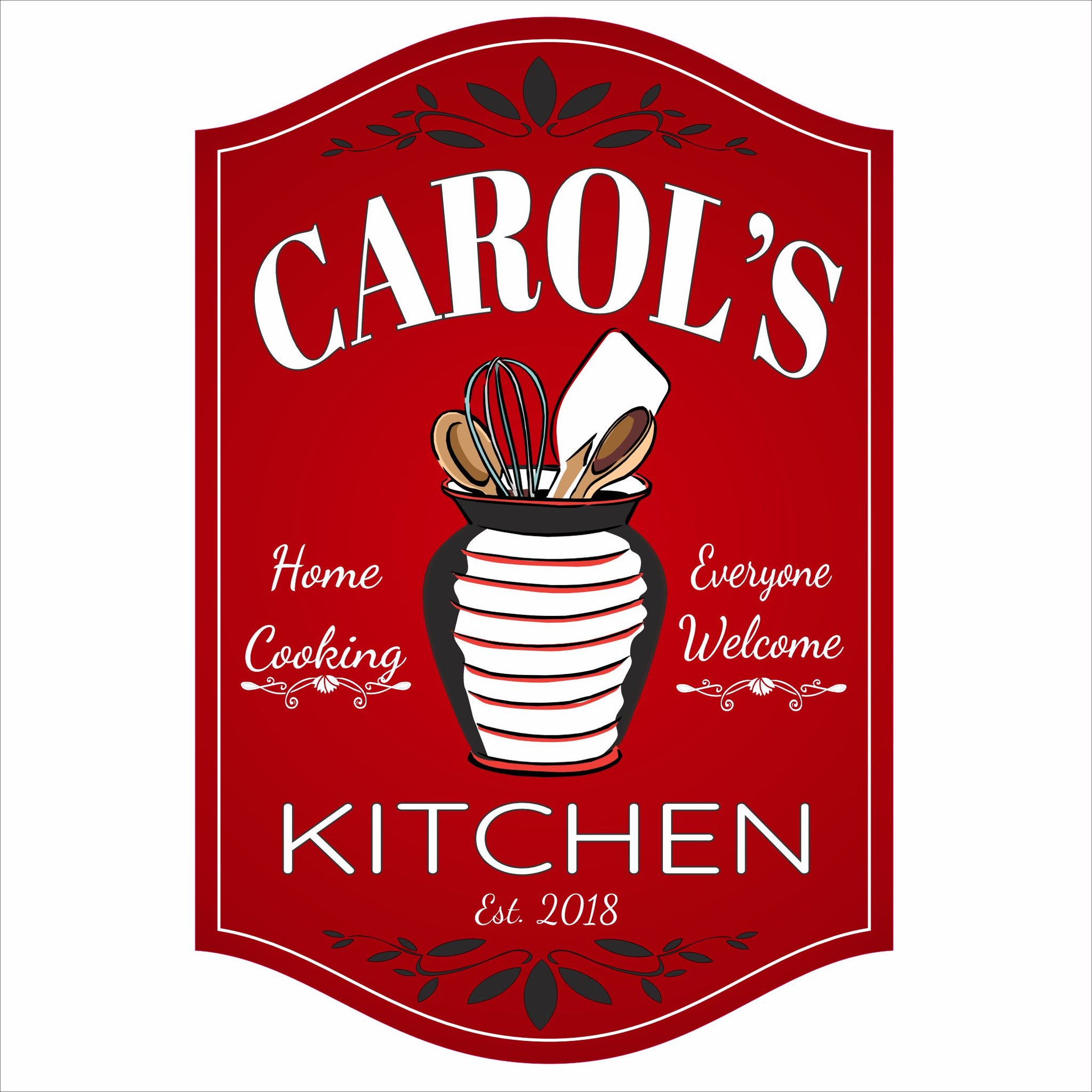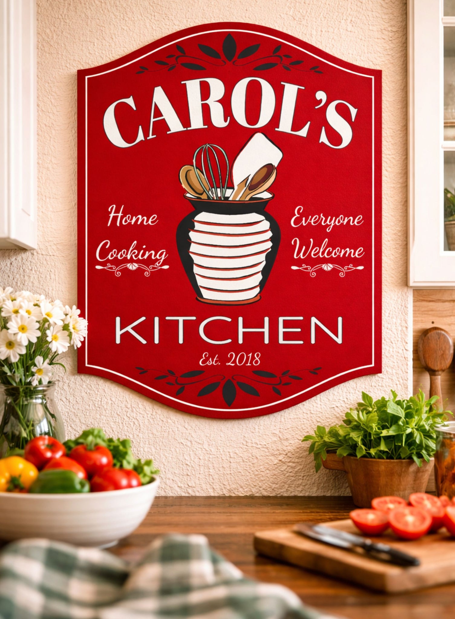 Add warm, welcoming charm to your kitchen with this personalized family name sign. Featuring classic red tones, vintage-style lettering, and a decorative utensil design, this custom wall décor creates a cozy, home-cooking atmosphere.