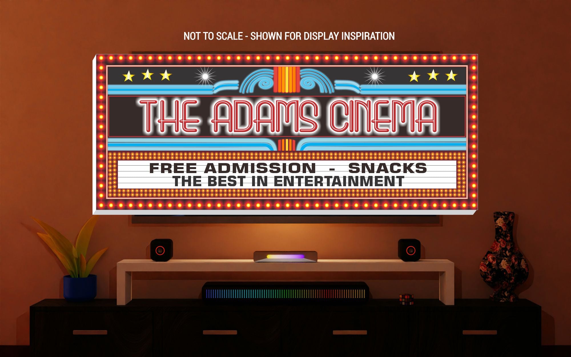 Turn your media room into a show-stopping home cinema with this personalized movie theater sign inspired by classic marquee signage. Featuring bold lettering, glowing bulb details, and customizable text, this design brings old-school theater charm into a modern home theater, game room, or entertainment space.