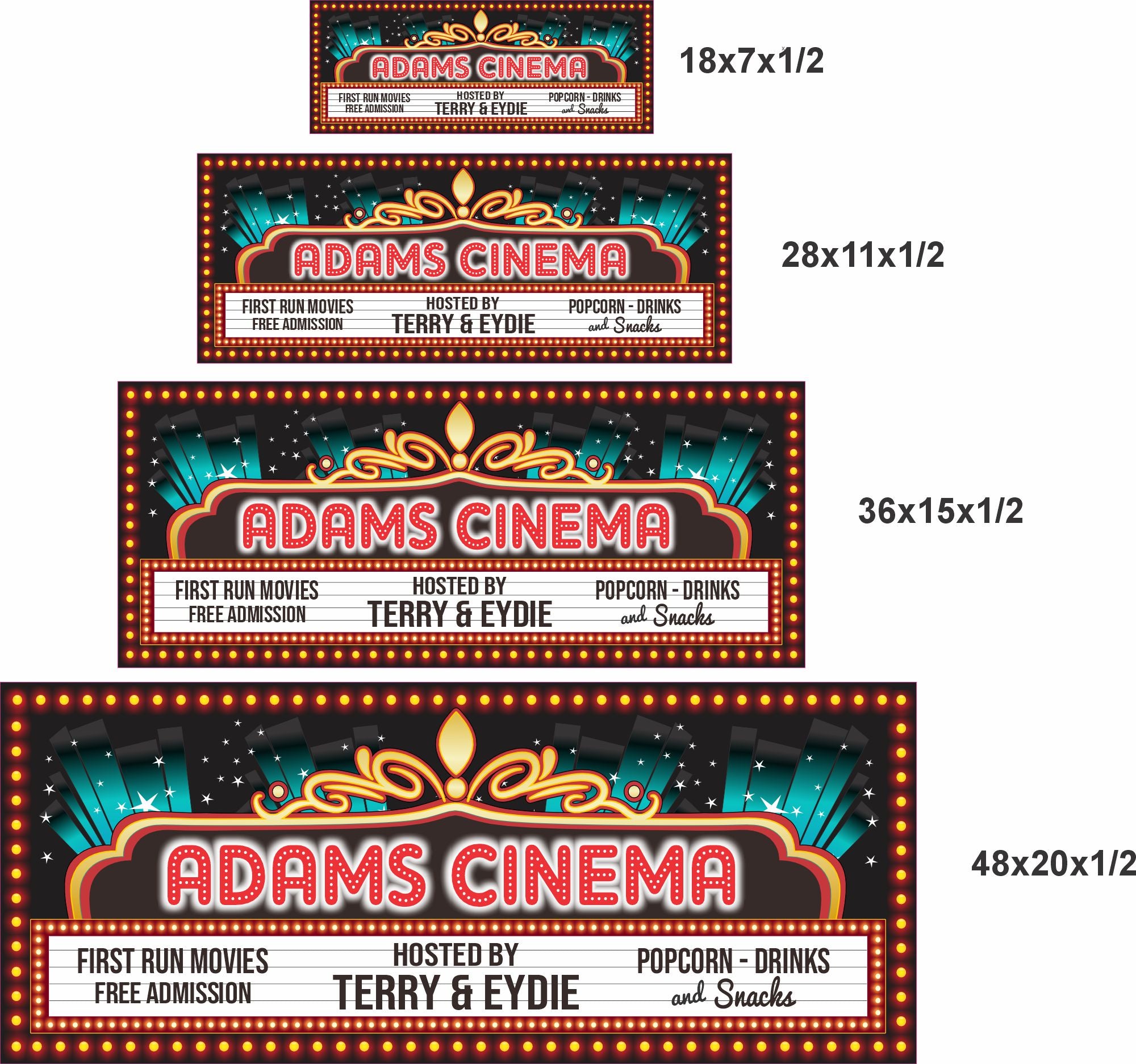 Create a custom home theater sign designed to look like a classic cinema marquee. This personalized movie room wall decor features bold retro styling that brings theater vibes to your home, media room, or game room.
