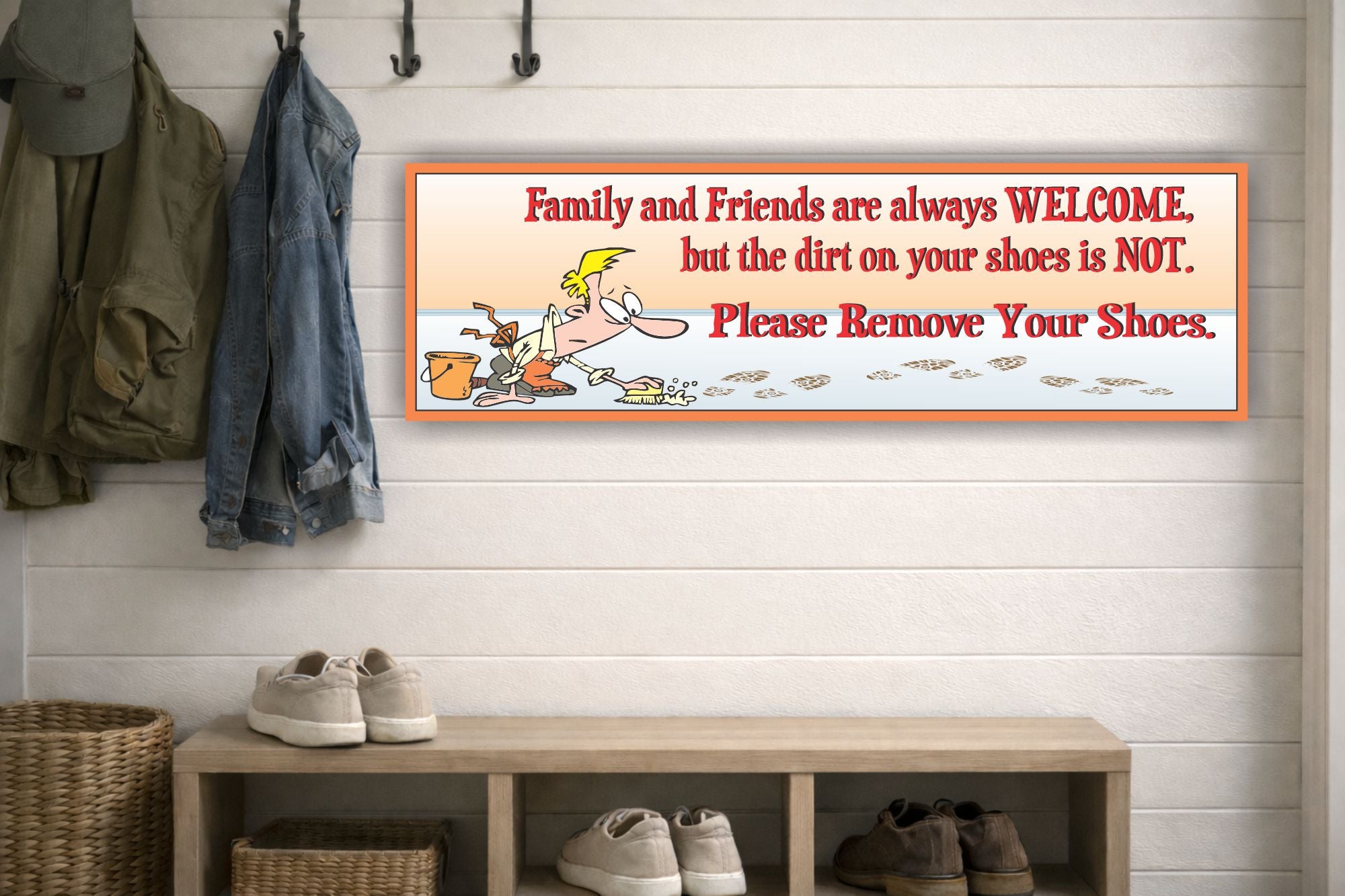 This humorous “Please Remove Your Shoes” wall sign adds personality and practicality to entryways, mudrooms, laundry rooms, and hallways. The playful artwork and bold lettering clearly deliver the message while keeping the tone welcoming and lighthearted.