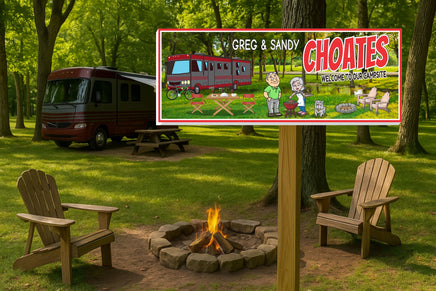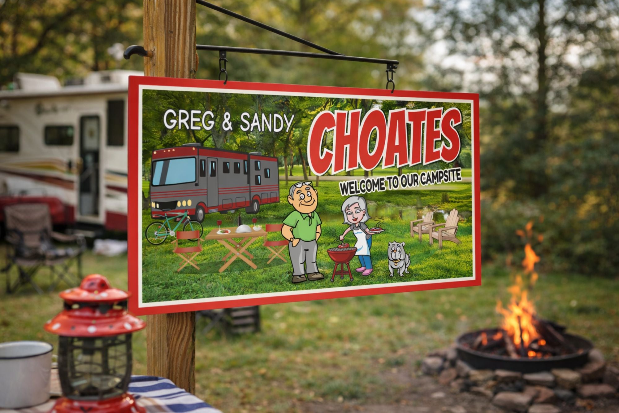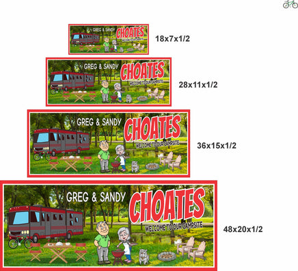 Create a warm and inviting atmosphere at your campsite with this personalized RV campsite sign. Featuring a mature cartoonish couple, their RV, bicycle, picnic table, campfire, and Adirondack chairs, this sign adds a touch of fun and personality to your outdoor space. All lines of text are editable, allowing you to customize the sign with your family name, names, location, or any other message that reflects your unique style. Perfect for RV enthusiasts, this durable and vibrant sign is ideal for displaying at your campsite, making it a welcoming retreat for family and friends. This custom campsite sign also makes a thoughtful gift for fellow campers. Embrace the spirit of adventure with this charming personalized sign.