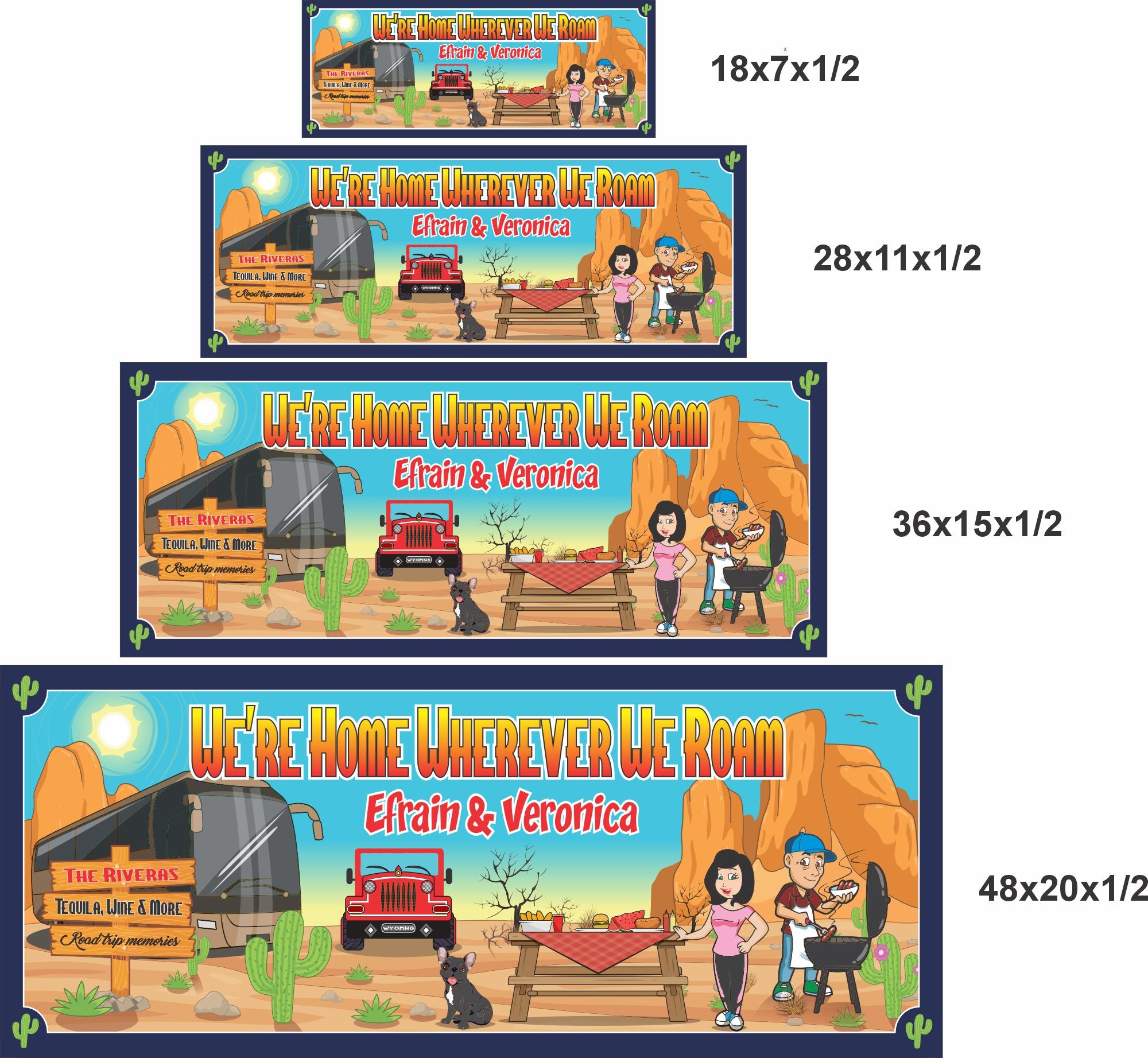 Celebrate life on the road with this personalized RV camping sign, designed for families who love traveling, campfires, and making memories wherever they roam. Featuring a fun camper scene with desert mountains, a picnic table, pets, and a campsite vibe, this custom wall sign adds warmth and character to your RV, campsite, porch, or home.