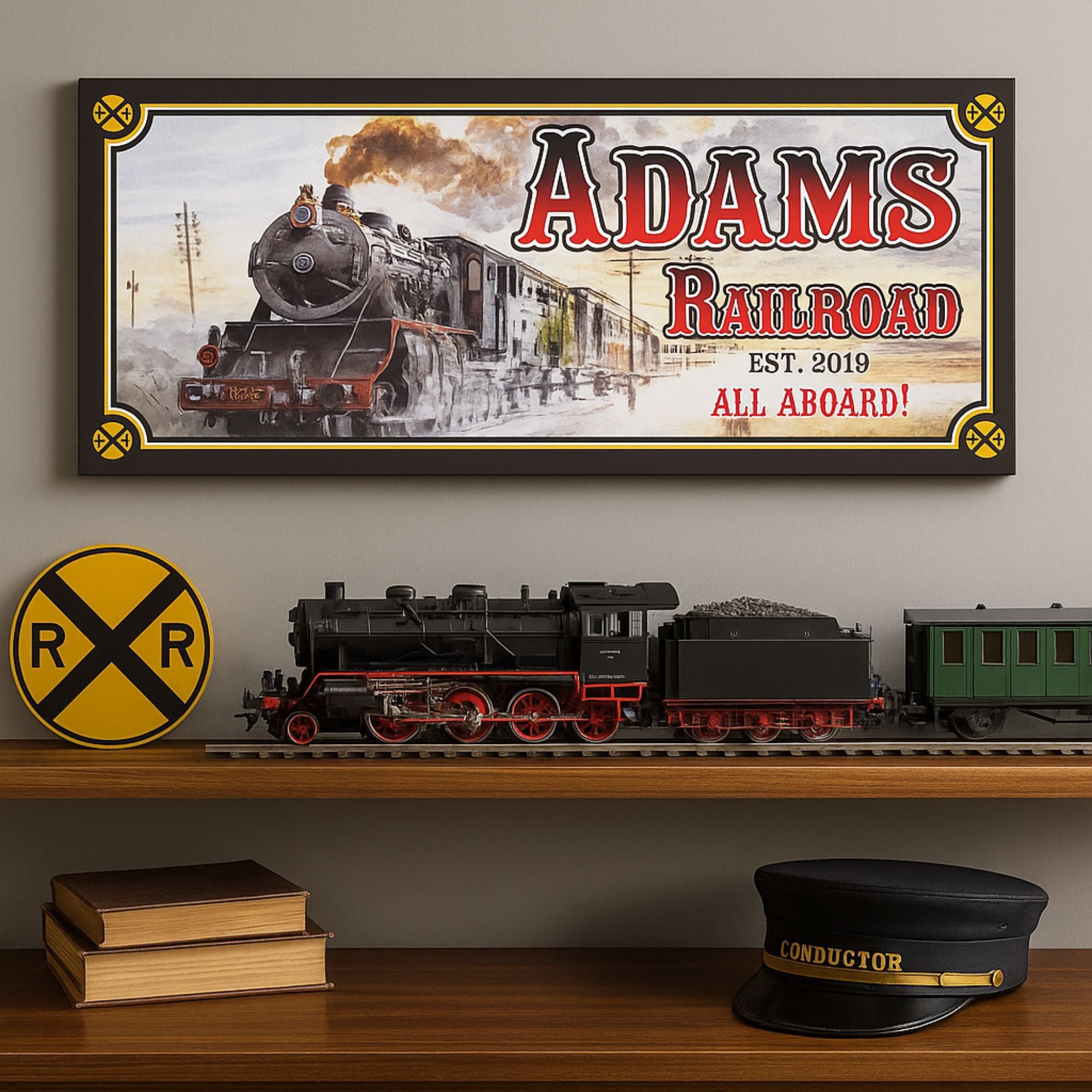 Capture the nostalgia of the golden age of railroads with this personalized vintage steam train sign. Perfect for train enthusiasts, home bars, man caves, dens, and themed rooms — and a fantastic gift for anyone who loves classic locomotives.
