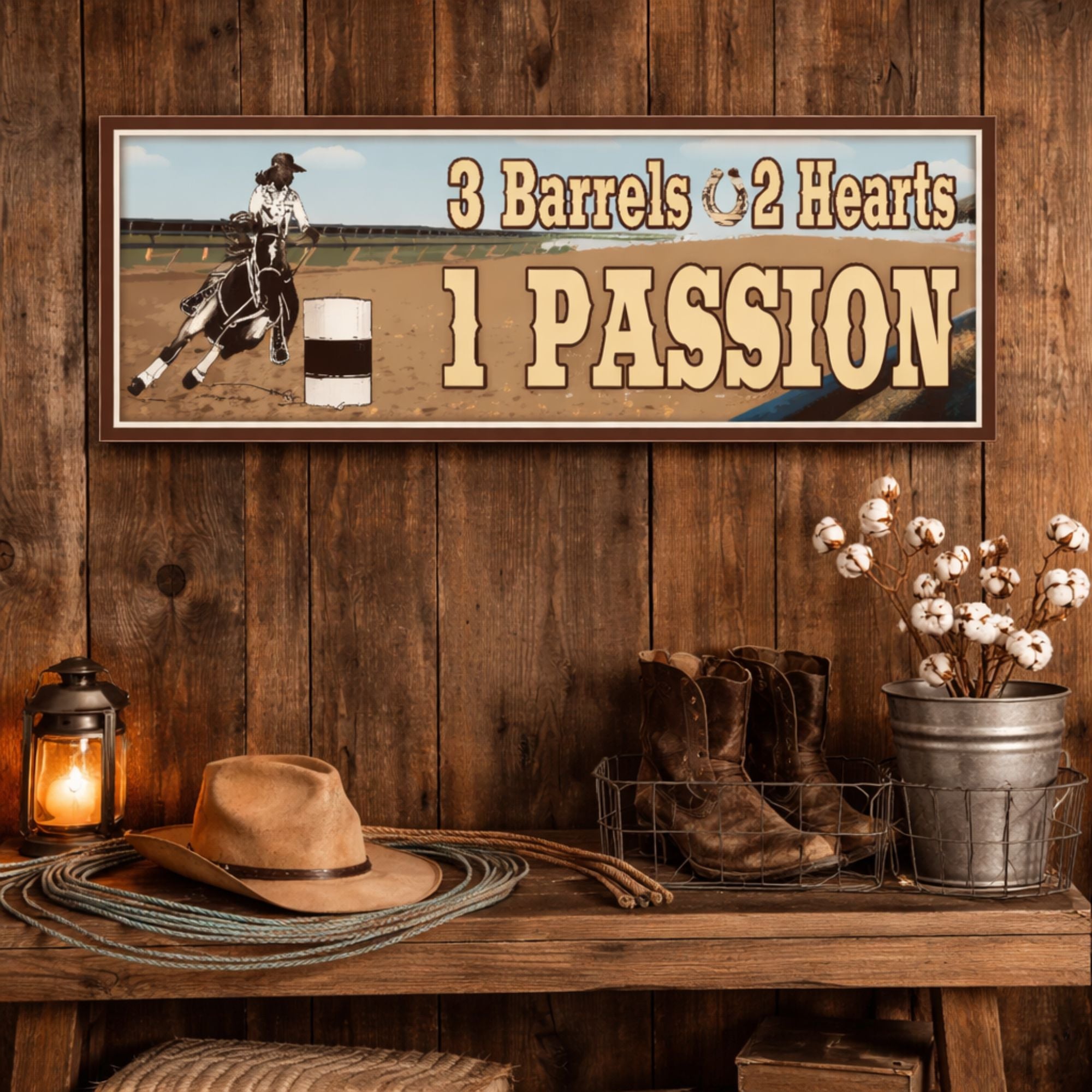 Celebrate the thrill and dedication of barrel racing with this 3 Barrels 2 Hearts 1 Passion sign. Designed with a dynamic arena scene and strong western typography, this piece captures the excitement and emotional connection riders feel every time they enter the arena.