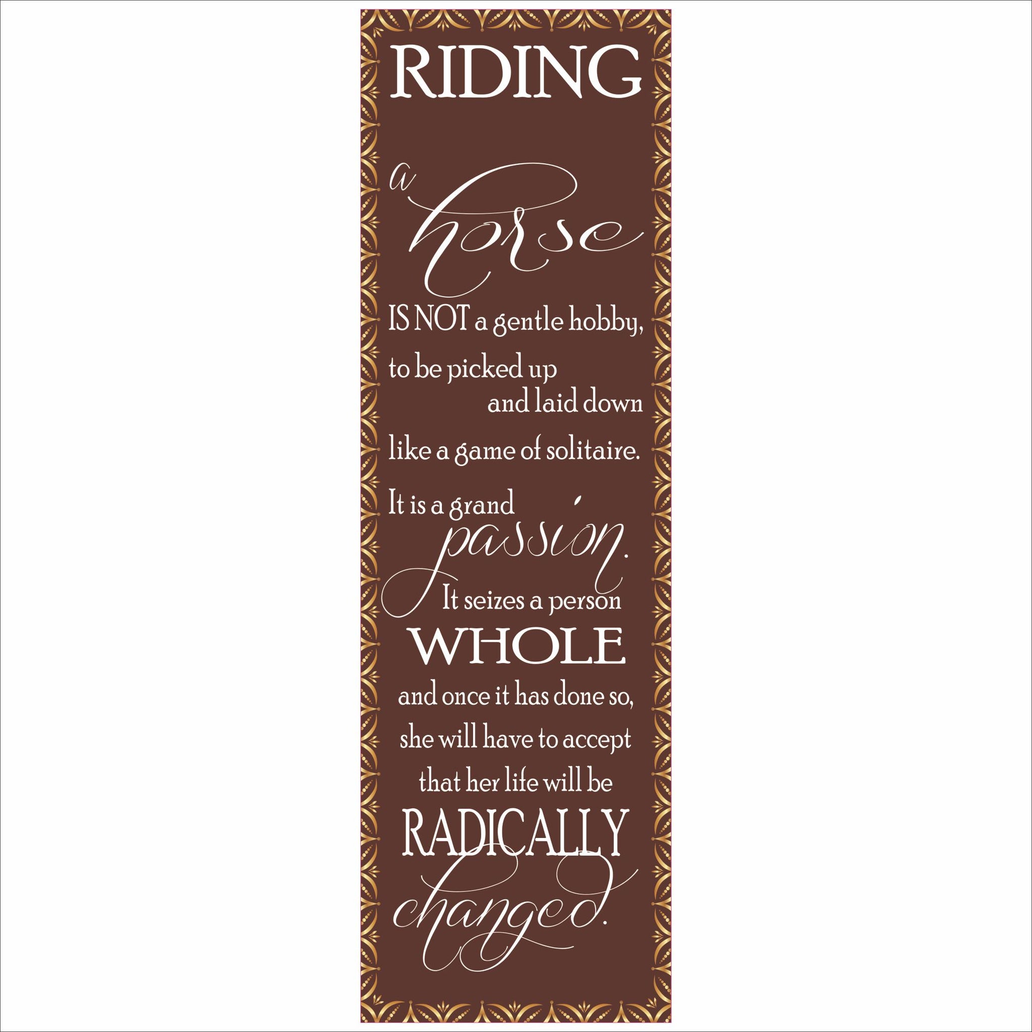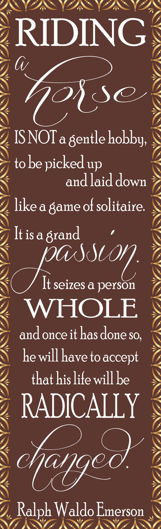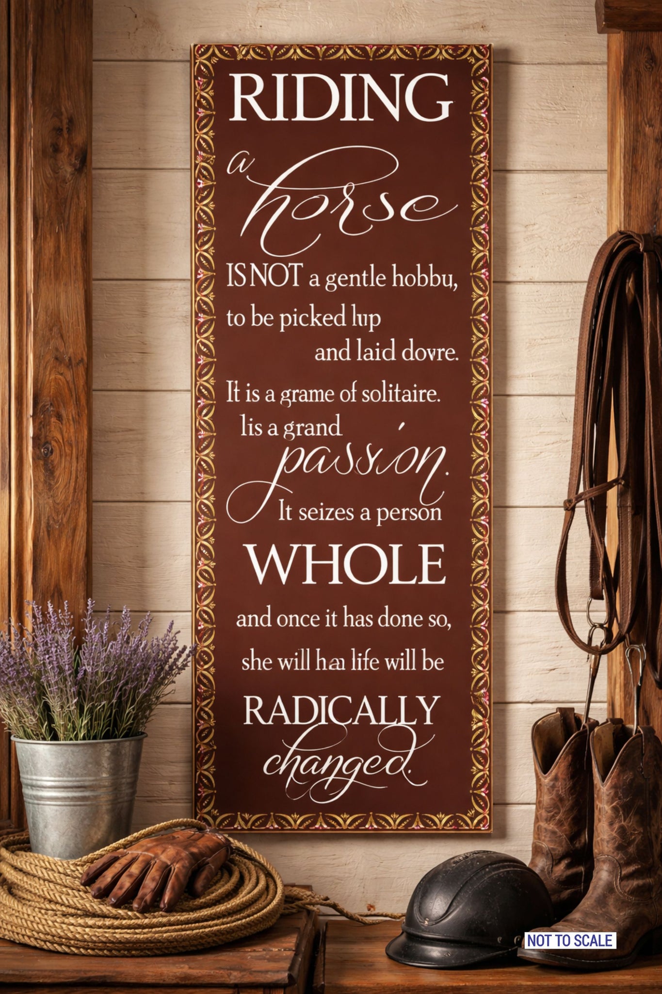 Sign reads: Riding a horse is not a gentle hobby, to be picked up and laid down like a game of solitaire. It is a grand passion. It seizes a person whole, and once it has done so, he (she) will have to accept that his (her) life will be radically changed.