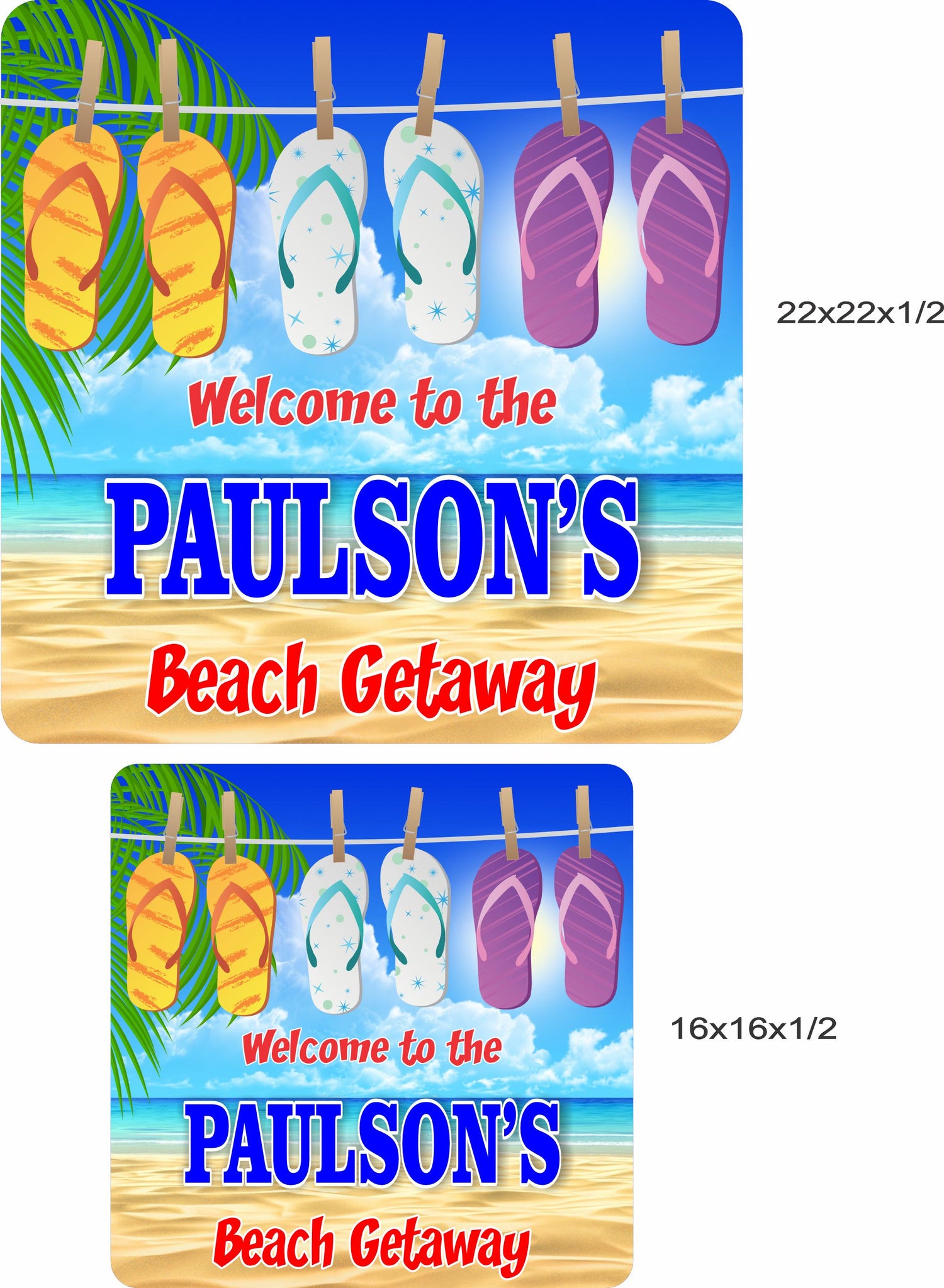 Welcome to paradise with our Custom Beach Welcome Sign, featuring charming flip flops hanging on a clothesline against a serene ocean background. Every line of text on this sign is fully editable, allowing you to personalize your greeting or message to perfectly match your beach house, vacation home, or seaside retreat. Crafted to capture the essence of beachside living, this sign is ideal for adding a touch of coastal charm to any entryway or porch. Customize yours today to make every arrival a little sunnier!