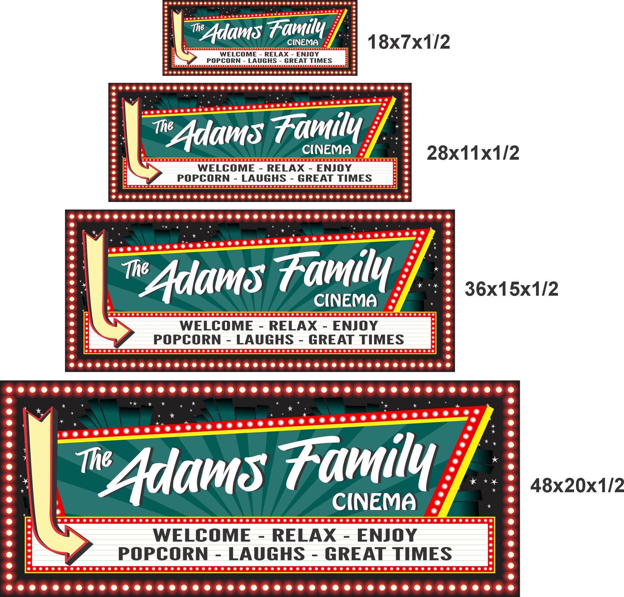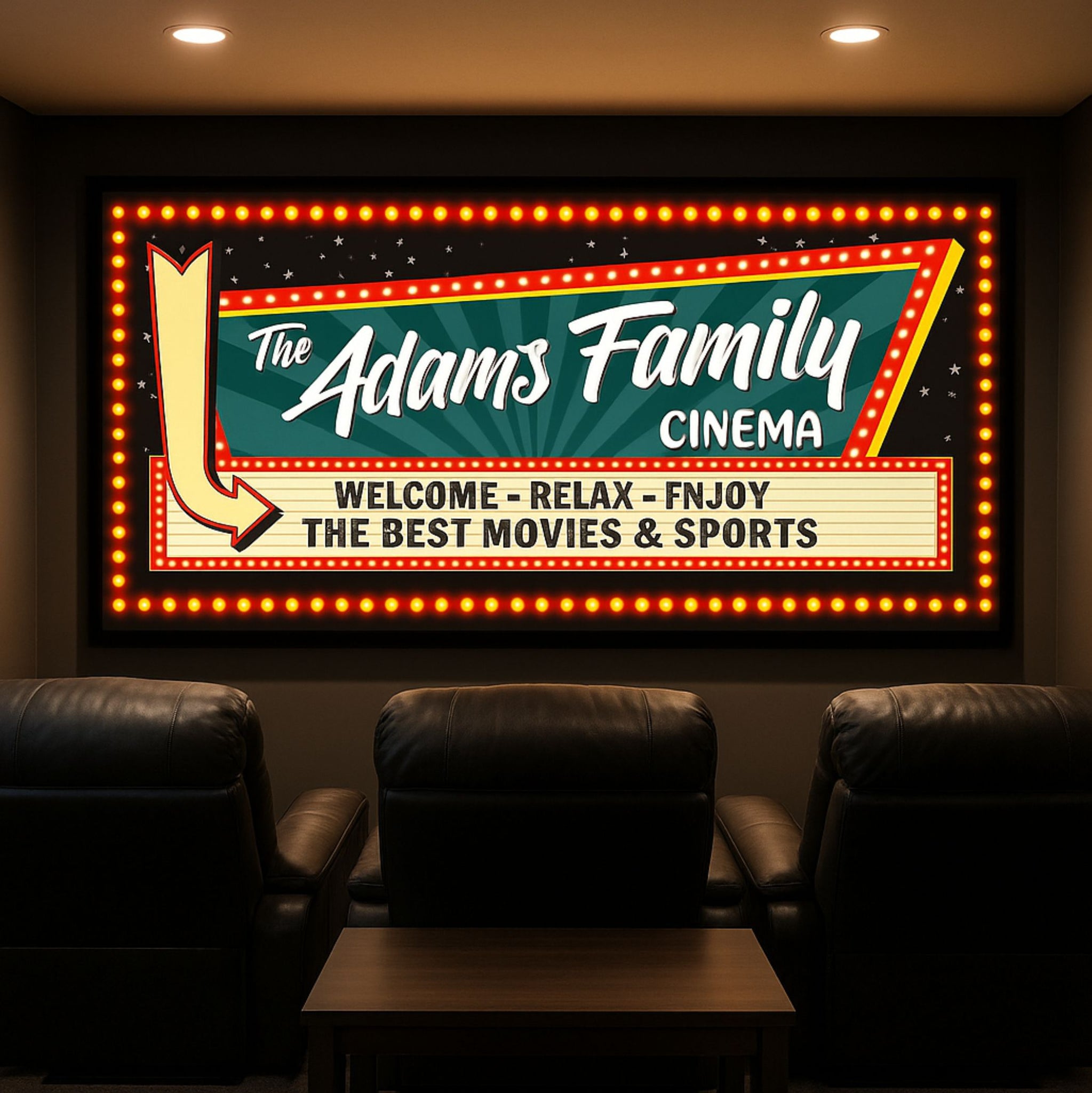 Create your own home theater experience with this personalized cinema marquee sign. Featuring retro lights, bold colors, and customizable text, it’s the perfect centerpiece for your movie room, media room, basement, or den. Each sign is printed on premium vehicle-wrap vinyl and mounted on rigid PVC for a vibrant, long-lasting finish that outperforms canvas prints. Add your family name and favorite movie-night phrase to make it uniquely yours.