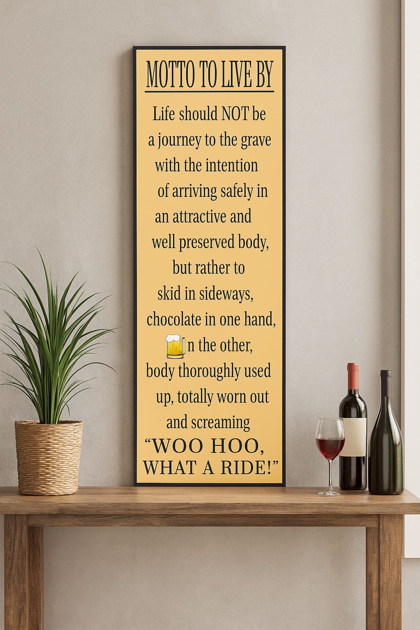 Add humor and personality to your home with this funny “Motto to Live By” wall sign — tall, slim, and easy to place anywhere you want a smile.