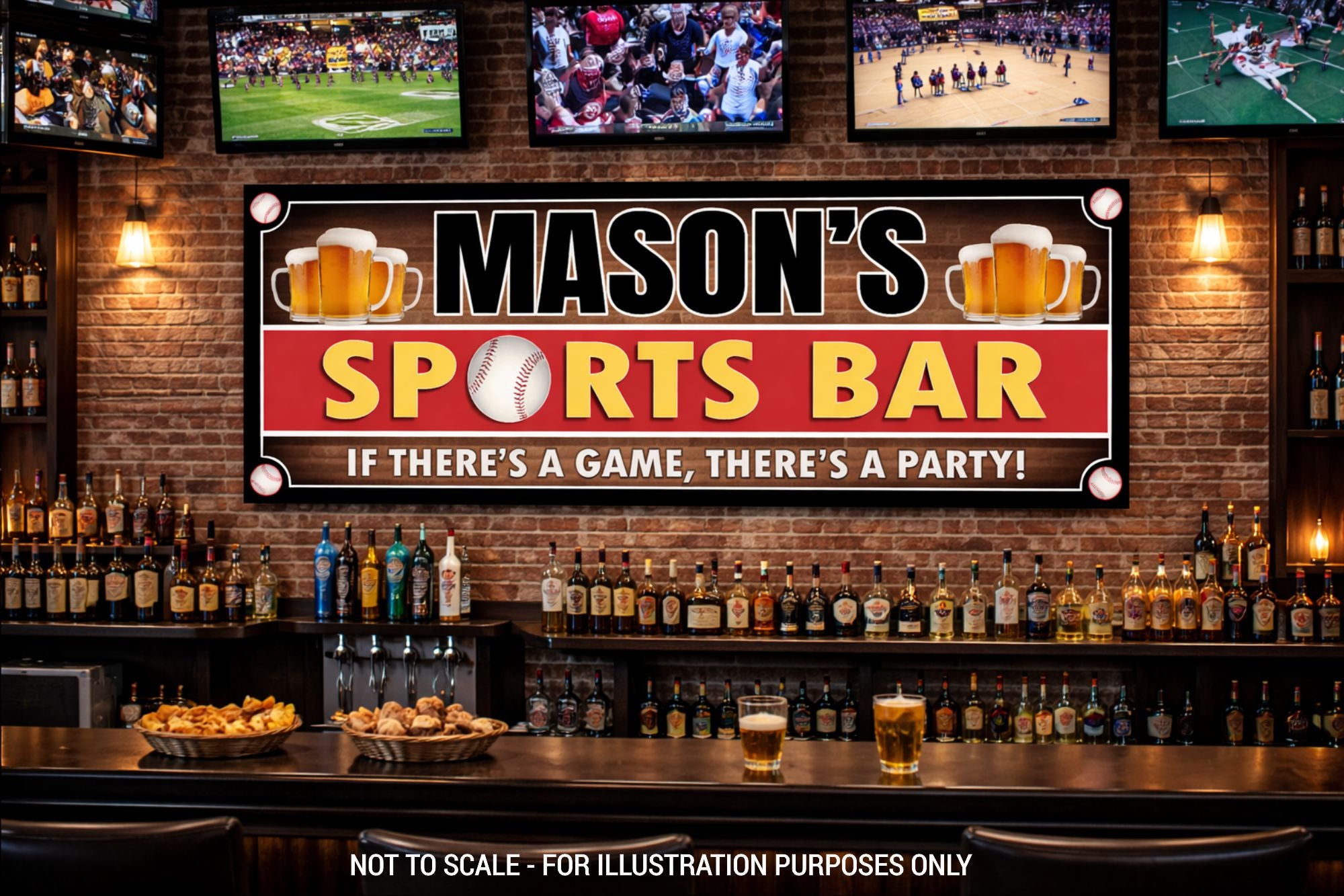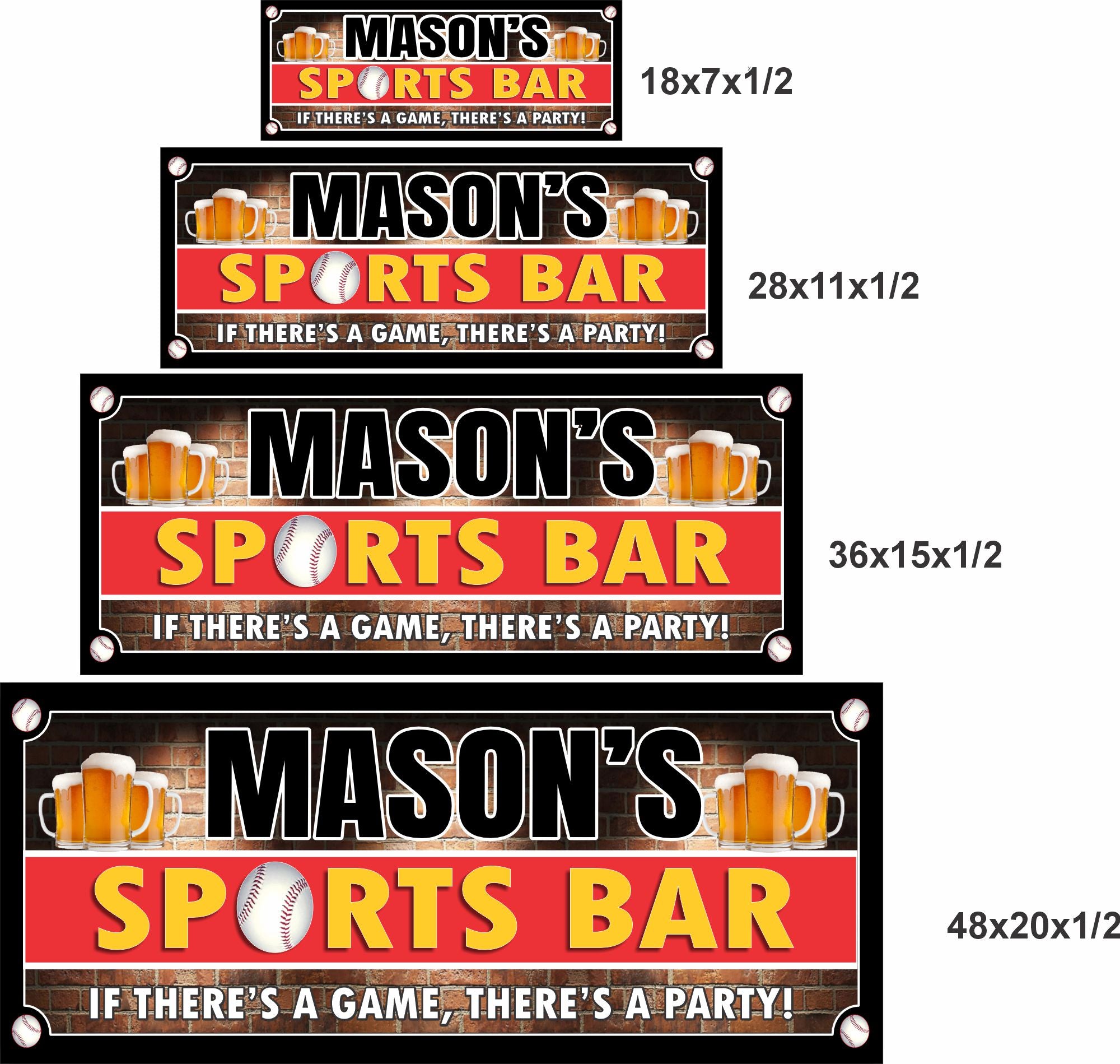Create the ultimate baseball-themed hangout with this personalized baseball sports bar sign. Featuring bold lettering, beer mugs, a baseball graphic, and a brick-wall sports design, this sign is perfect for man caves, game rooms, home bars, and baseball fan spaces.