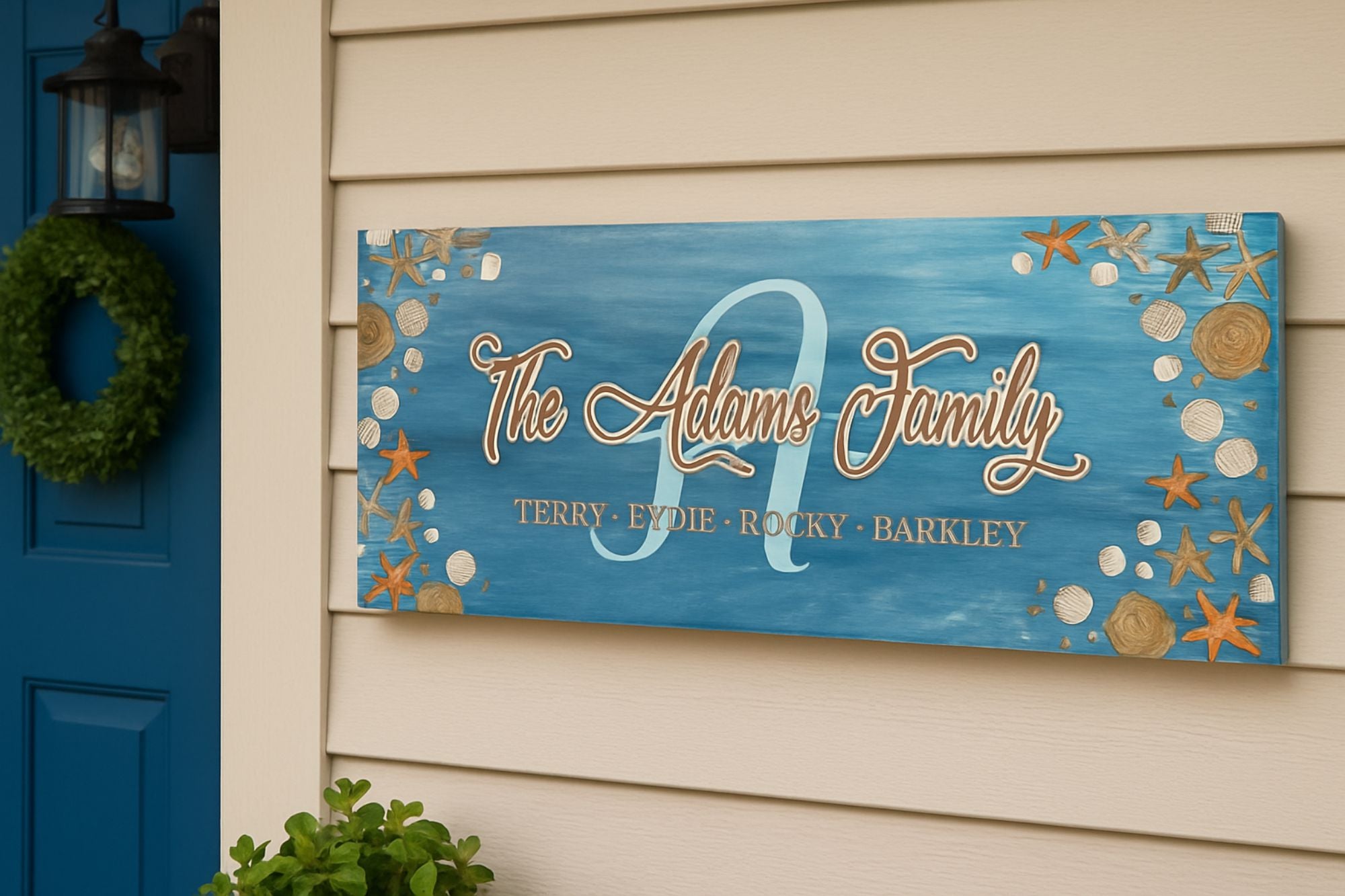 Bring a touch of seaside serenity to your home with this personalized beach family name sign. Featuring soft ocean blues, seashells, starfish, and your family name in elegant script, it’s the perfect accent for beach houses, patios, porches, entryways, or any coastal-inspired space.