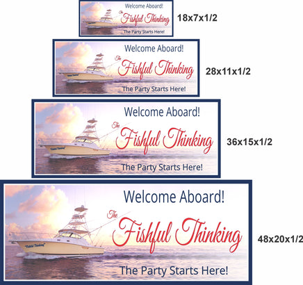 Elevate your nautical décor with our Personalized Welcome Sign, designed to bring the essence of the sea to your beach house or dock. This captivating sign features a serene seascape with a large yacht and fishing poles, set against a stunning backdrop of a golden and blue sky sprinkled with fluffy clouds over calm waves.
