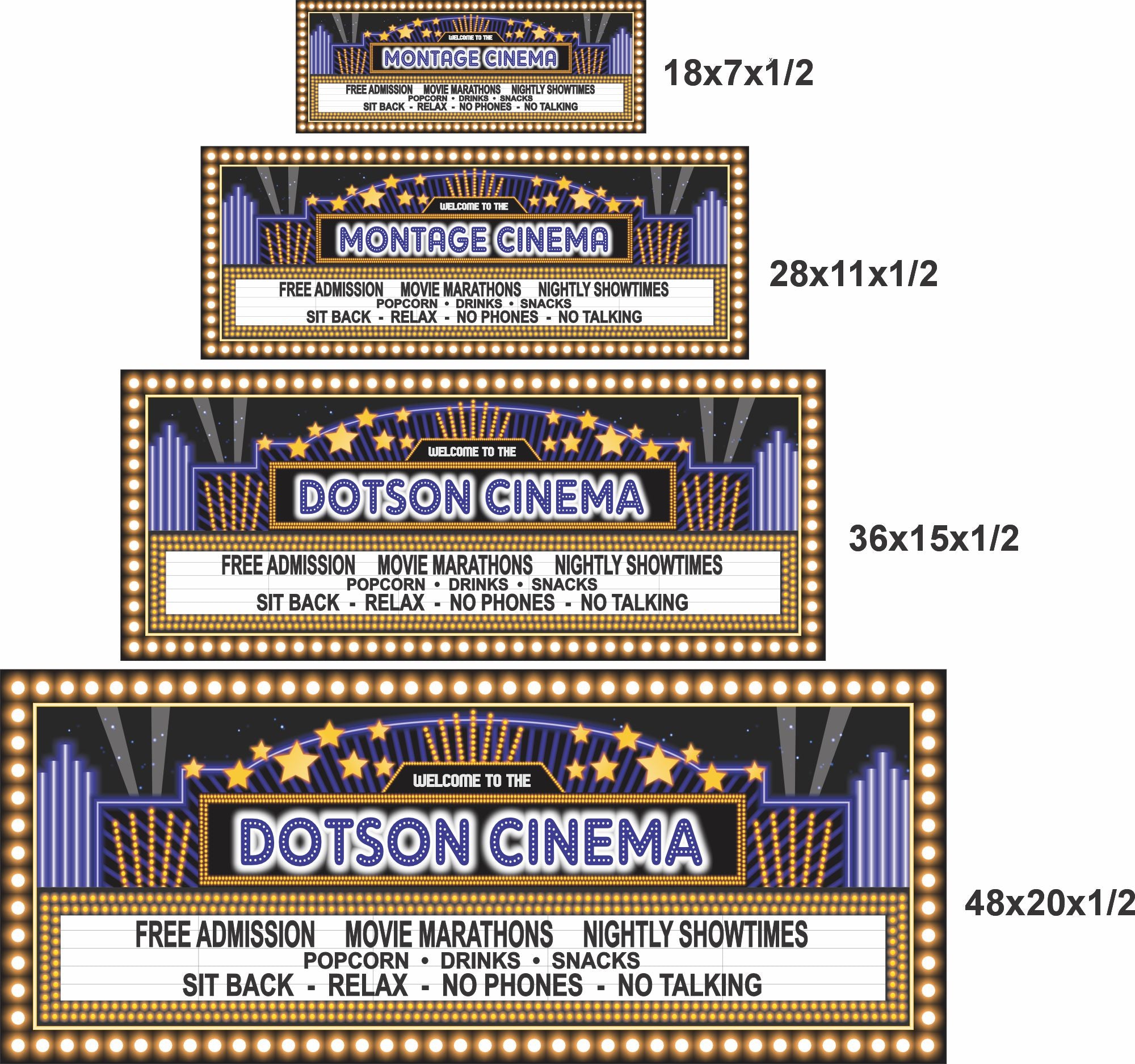We personalize the cinema name and wording while keeping the authentic theater feel. The marquee “lights” are printed as part of the artwork, so you get the dramatic look without wiring or maintenance.
