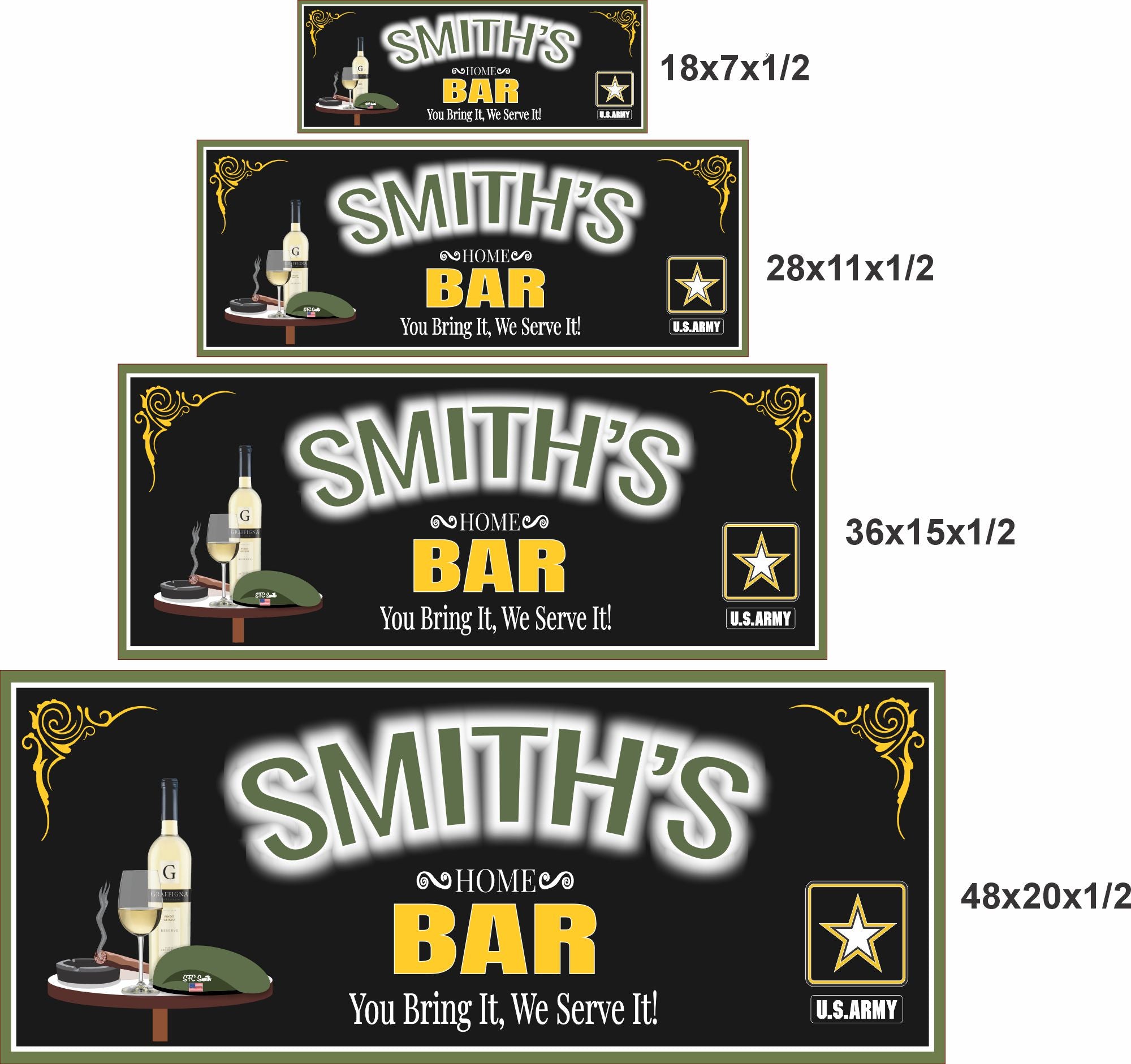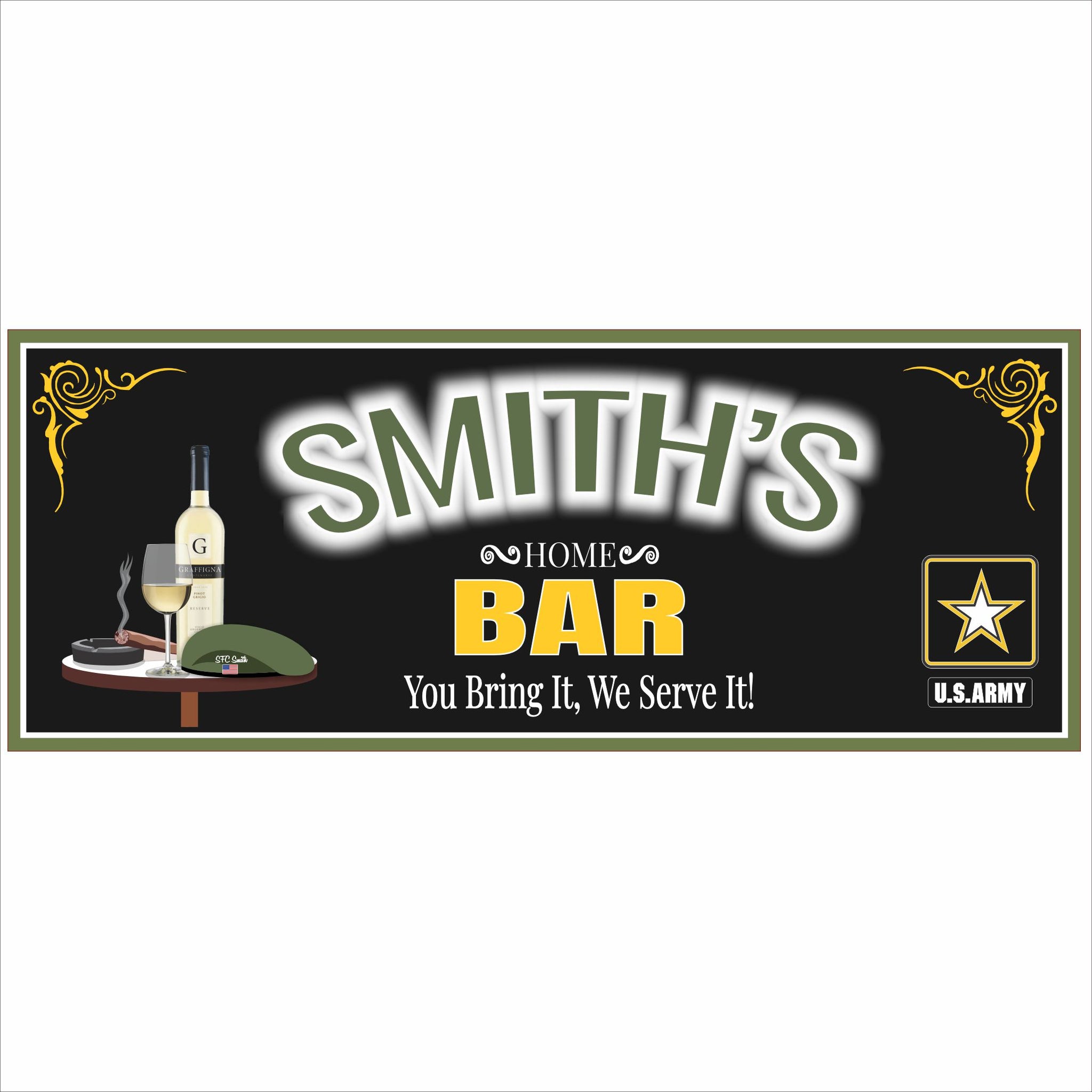 Show your pride in our armed forces with a personalized military-themed bar sign designed for home bars, man caves, and entertainment spaces. This unique design features bold, glowing-style lettering that spells out your custom name, along with classic military-inspired graphics.