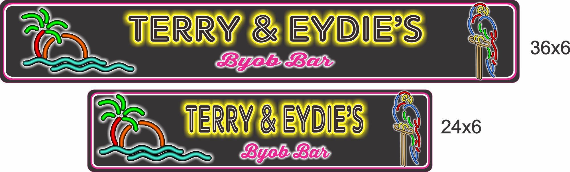 • Features a neon-style tropical palm tree, sunset, parrot, and custom bar name — fun decor